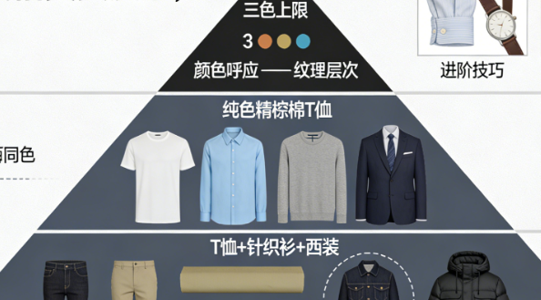 确立中性色主导:黑、白、灰、海军蓝、卡其、橄榄绿,这些颜色构成了衣橱的“无声背景板”,它们彼此之间几乎可以任意组合,极大降低了搭配难度。