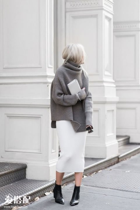 灰色oversized毛衣+白色一步裙+袜靴。▲