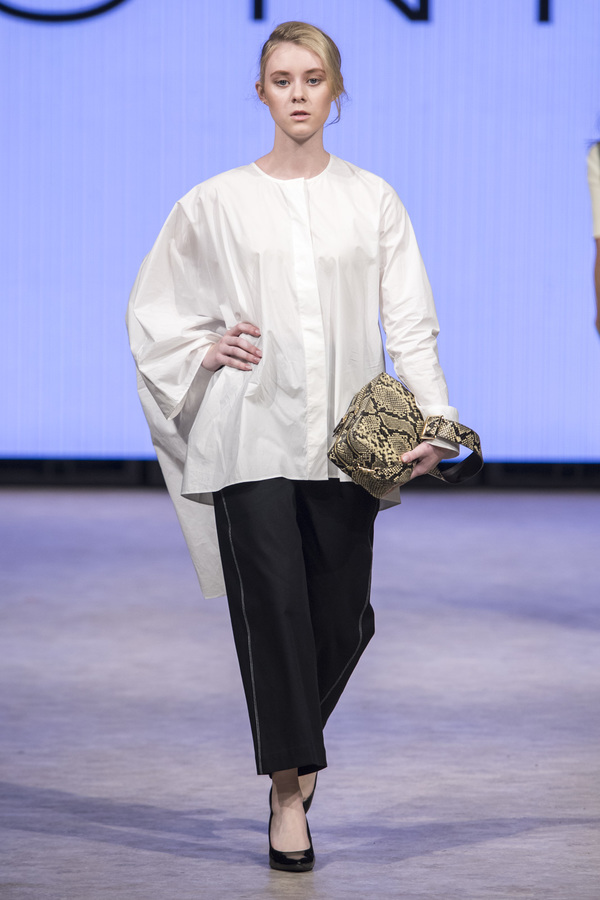 今晚首秀的品牌YONFA,是来自日本的韩裔设计师Kim Yonghwa,以实用,简约优雅的穿搭展示了自己的时装设计作品,也为今晚的首秀做了最好的结束。在Yongwha这一季展示中,她的设计以宽大的夹克,中长度的独特裙摆设计为主。Yonghwa的服饰保留了基本衣料的原始属性,运用大量地羊毛,棉布,搭配单一配色的白色、海军蓝、黑色和深棕色,据有极具日式风格的优雅极简风格。
