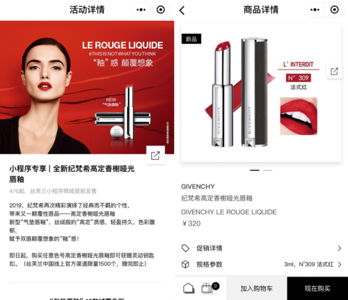 对小程序情有独钟的还有美妆行业。丝芙兰现已在中国74个城市扩展至235家门店,目前正通过微信小程序,获得更大的美妆线上消费者市场份额。4月6日-4月10日,纪梵希高定香榭哑光唇釉在丝芙兰小程序官方商城独家首发。集“一站式”和“社交购物”于一身的丝芙兰小程序官方商城给中国消费者带来了更完善的消费体验,而纪梵希这次突破性的唇品以“丝芙兰小程序官方商城首发款”与粉丝们见面,势必会在丝芙兰小程序官方商城抢占一波流量红利,为自身彩妆业务带来新的增量。